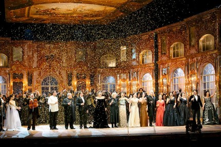 Бас Юрий Власов исполнил песню Варлаама из «Бориса Годунова» Мусоргского, а Максим Аксенов принял участие в сцене Графини из «Пиковой дамы». Из этой пары молодых отечественных певцов заметное впечатление произвел лишь Юрий Власов, а от трактовки Максима Аксенова веяло явной вокальной неуверенностью, каким-то робким, едва преодолеваемым ученичеством. И если не забыть сказать, что в программе концерта были представлены также два танцевальных номера, то миссию рецензента можно считать выполненной. Обворожительно утонченная и трепетная Юлия Махалина представила номер «The Way» в хореографии Е. Клявина, поставленный на музыку «Медитации» из оперы «Таис» Массне (соло на виолончели превосходно исполнил Борислав Струлев). Мария Пахес, знаменитая испанская танцовщица фламенко, в сопровождении своего ансамбля с большим чувственным драйвом вынесла на суд московской публики фрагмент из спектакля «Автопортрет», на несколько минут погрузив сцену Большого театра в ярко темпераментную атмосферу испанской страсти. Конечно же, и на этот раз самым последним номером программы стал едва ли не обязательный для подобных вечеров оперный бис – еще одна «Бриндизи», но на этот раз из оперы Верди «Травиаты», для исполнения которой всем миром на сцену вышли и все участники концерта, и сама царственная юбилярша.