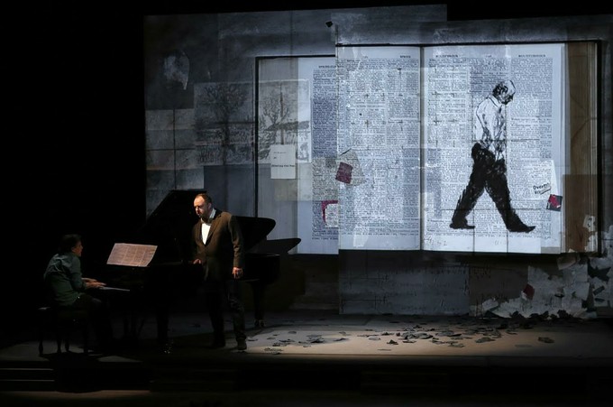Как это происходит? Во-первых. Гёрне, который очень трепетно относится к традиции исполнения песен Шуберта, согласился «вынести» страдания лирического героя «Зимнего пути» на всеобщее обозрение. Это уже немалый комплимент постановке. Через рисованные углем картинки Кентриджа остросоциального содержания, лирический герой уподоблен гоголевскому «маленькому человеку», который не может больше молчать «под липой» о своей трагедии. И, во-вторых, Хинтерхойзер – первый исполнитель всяких авангардных музыкальных опусов наших дней – берется вдруг за изящный романтический материал, и ему, вернувшемуся из путешествия в будущее, явно есть, что сказать про Шуберта.