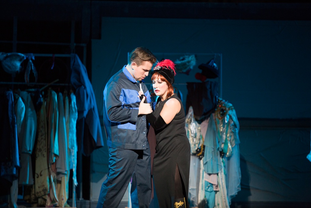Канио (Теймураз Гугушвили) — обласканный светом софитов и невиданными гонорарами молодящийся премьер, поп-идол, опустошенный ежедневной погоней за внешним успехом. Под стать ему стареющая супруга Недда (Нина Шарубина). Эта примадонна эстрадного подиума, уставшая от фанфаронства глупого мужа, кидается в объятия рабочего сцены, брутального Сильвио (Илья Сильчуков), который рад удовлетворить собственное тщеславие с шикарной женщиной, пусть уже и не первой молодости. Отталкивающего вида клоун Тонио (Сергей Москальков) также не прочь поразвлечься с женой своего приятеля. Беппо (Янош Нелепа), женоподобный любитель сверкающих нарядов и украшений, герой-любовник на сцене, в частной жизни оказывается жалким неудачником.