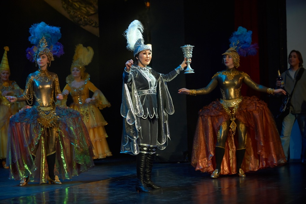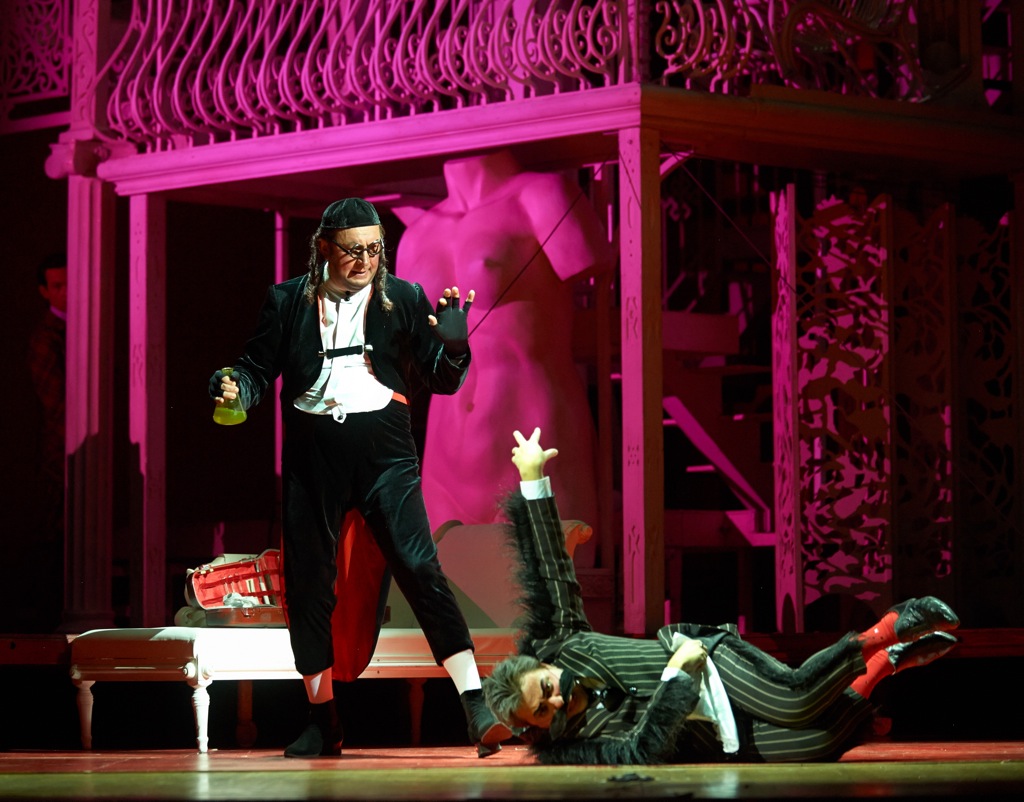 В музыкальном аспекте (по части оркестра и хора) в этом «Напитке», в целом, всё сложилось очень даже неплохо – намного «забористее» и стилистически точнее, чем в «Цирюльнике»: роль невероятно чуткого медиума между стилем бельканто и оркестром вместе с солистами и хором взял на себя дирижер-постановщик из Нидерландов Винсент де Корт. В партии Неморино выступил наш старый добрый знакомый Алексей Татаринцев. Хотя в состав этой постановки в «Новой Опере» он вошел уже после ее премьеры, эта партия в стенах родного театра певца давно стала для него поистине коронной. В этом же смогла убедиться и казанская публика. В партии Дулькамары после огромного перерыва довелось услышать Олега Диденко, участника московской премьеры, ныне в «Новой Опере» не работающего. Почти уже за 8 лет, прошедших со дня премьеры в Москве, свои вокальные дивиденды певец явно подрастерял, так что преувеличенно гротесковая постановка явилась для него блестящим шансом отвлечь публику от накопившихся за эти годы стилистических проблем.