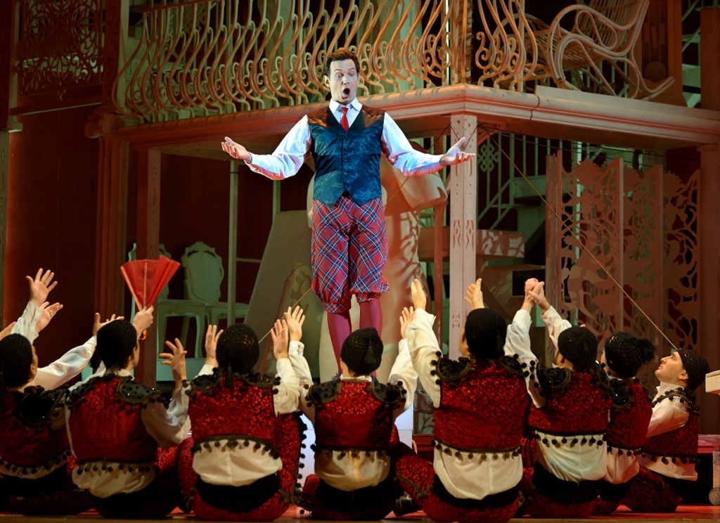 Дон Базилио выведен ортодоксальным евреем в ермолке и брюках-дудочках. Пышные накладные усы и полосатый пиджак Дона Бартоло поразительно напоминают судью Кригса из кинофильма «Здравствуйте, я ваша тетя!», которого незабываемо сыграл Армен Джигарханян. Во втором акте расписной сюртук Дона Бартоло, скорее, взывает к облику русского вельможи, действительного статского советника из какого-нибудь департамента. Уличные музыканты – массовка в нарядно-фольклорных испанских костюмах, а полицейские – не кто иные, как королевские мушкетеры из романов Дюма. Театральной правдивости истории, заложенной в музыке и либретто, вся эта катавасия и с костюмами, и с нелепыми мизансценами явно не способствует, и поэтому, когда Бартоло остается с носом, а Розина с Альмавивой обретают друг друга, вздыхаешь с облегчением: наконец-то, мы добрались до финала!
