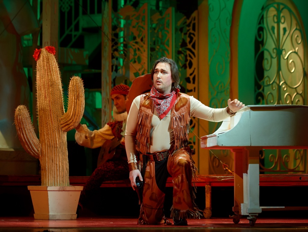 Визуальный ряд всей постановки недвусмысленно тяготеет, с одной стороны, к эксцентрике мюзикла с «подтанцовками» и даже цирковой клоунаде. С другой стороны, он подвержен ряду моментов, которым присуща наивность и безыскусность комедии dell’arte на современный лад (или, попросту говоря, незатейливость «мыльной оперы»). Граф Альмавива – это теперь какой-то Дон Педро в ковбойском костюме, а его появление в финале первого акта в маскарадном костюме трезвого – заметьте, даже не пьяного! – Дон Кихота, «сидящего» на своем Россинанте, но при этом уверенно стоящего на своих собственных ногах, чрезвычайно смешно и закономерно вызывает оживление в зале. Но кому какое дело, что подобное совершенно «не в кассу»! Хотя нет, с театральной кассой всё в полном порядке: билеты на весь фестиваль были раскуплены еще как давно…
