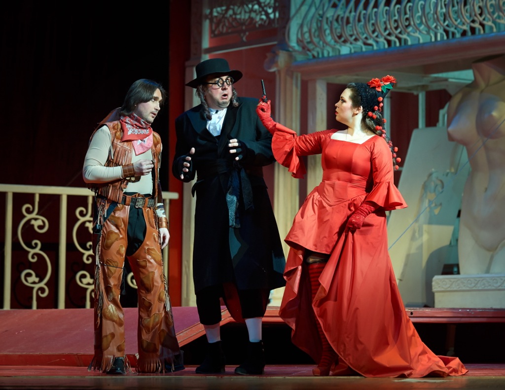 В постановке Юрия Александрова сей важный и единственно определяющий в этой опере аспект заслонен лишь внешним антуражем развития действия. Постановка «Любовного напитка», осуществленная им в тандеме со сценографом и художником по костюмам Вячеславом Окуневым, естественно, – самая молодая в сегодняшнем репертуаре труппы. Вполне «по-хорошему» семь лет назад нашумев в столичной «Новой Опере», сегодня в своем новом воплощении она предстает всё такой же: при всей ее иллюстративной поверхностности, эклектике, перегруженности разнополярными ассоциациями и даже явной эпатажности, она по-прежнему довольно забавна, зажигательна и жизнерадостна. Семилетняя выдержка со времен московской премьеры принципиально на ней не сказалась, просто за счет переноса с заведомо малой сцены на большую спектакль воспринимается теперь более рыхлым и наивным, более спокойным и мягким.