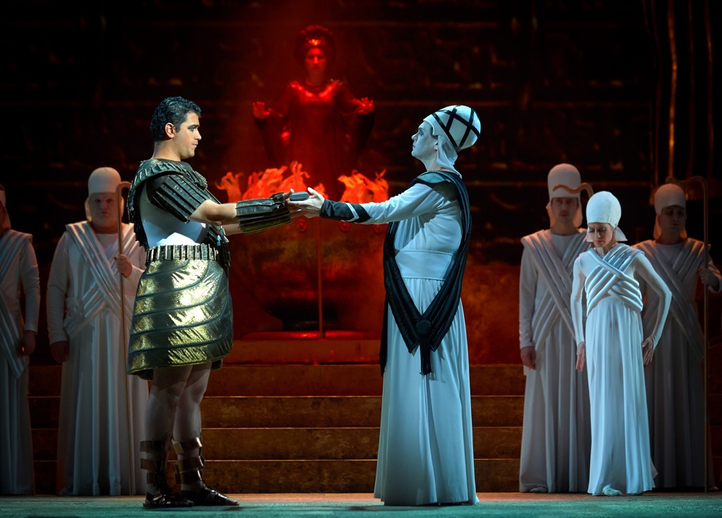 Верди в этой своей опере, конечно же, просто нещадно заставил теноров в самом начале петь ответственную выходную арию буквально с наскока, безо всякой распевки. И эта ария действительно прозвучала несколько угловато – зажато и напористо. Но по мере продвижения вглубь партитуры голос певца стал откликаться заметно мягче уже во второй (храмовой) картине первого акта. К третьему акту – к дуэту Аиды и Радамеса – тенор распелся окончательно, поставив промежуточную финальную точку на весьма впечатляющей высокой фермате. Оба дуэта четвертого акта – подчеркнуто драматический с Амнерис и любовно-лирический с Аидой – певец также провел весьма достойно.