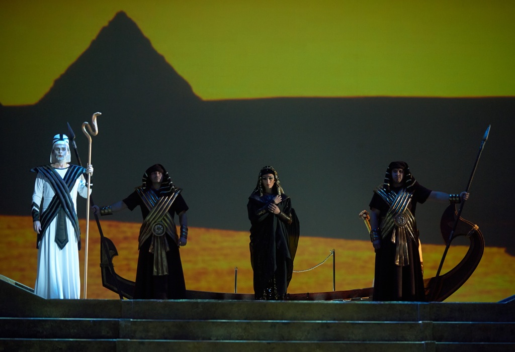 Читатель, по-видимому, давно уже задается вопросом, почему, вынеся тезис о постановочной элегантности обсуждаемой «Аиды» в заголовок этого раздела, мы начали разговор не с постановки как таковой, а с ее музыкальной части. Ответ прост: именно потому, что на сей раз неожиданная органичность режиссерского и сценографического подхода, основанная на синтезе традиционных средств театра и видеопроекционных технологий, закономерно и привели к примату музыки.