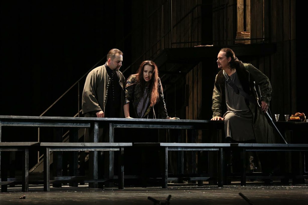 и, тем самым, добавил в свою коллекцию исполненных партий героев-любовников очередную удачную премьеру. Лично мне кажется, что голос этого певца в наибольшей мере раскрывается в русском репертуаре, хотя и в итальянском он тоже хорош. Ну и актерски «сын» не отставал от «бати» — сколько ярости и страсти было в сцене преследования Эммы и сколько обреченности потом в финале, когда полностью потерянный Андрей бродит по сцене меж раскольников, привычно пытается угощать девушек и абсолютно не осознает предстоящей смерти (правда петь тихо с таким большим голосом ему было явно непросто, но он справился даже с этим).