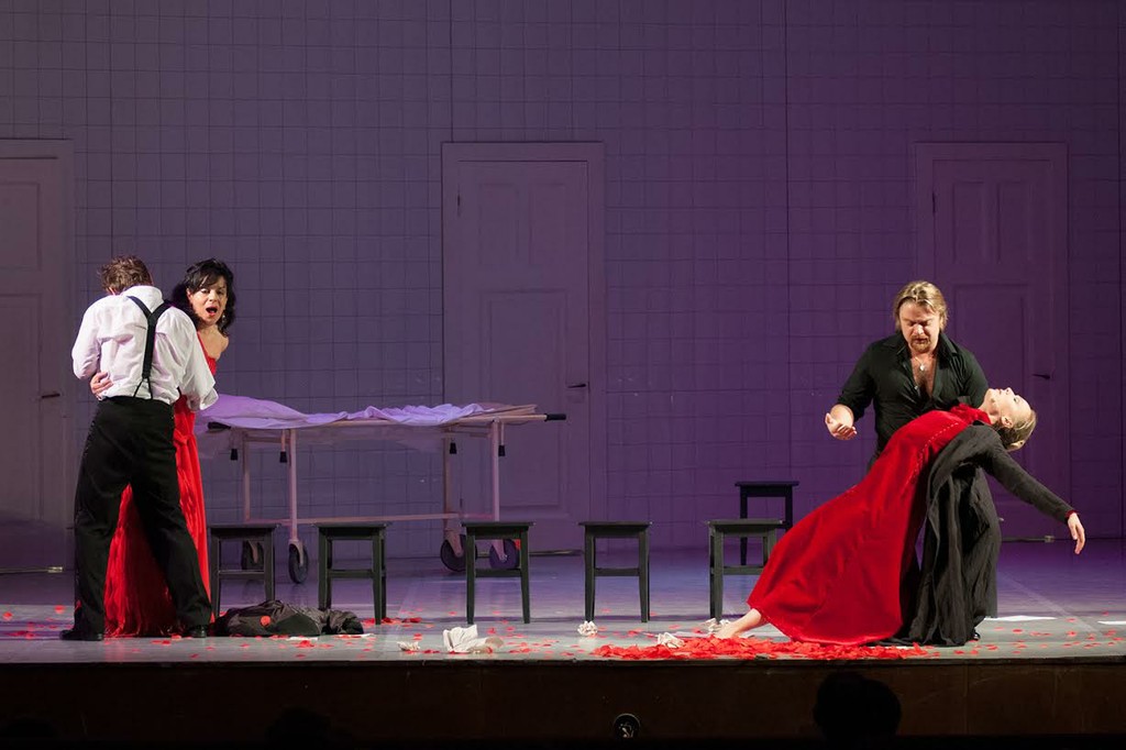Огромная, эллиптически изогнутая белая стена, сложенная из кафеля, стала главным и единственным элементом сценографии — если не считать больничной каталки.
