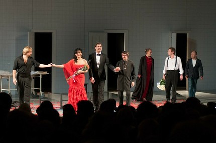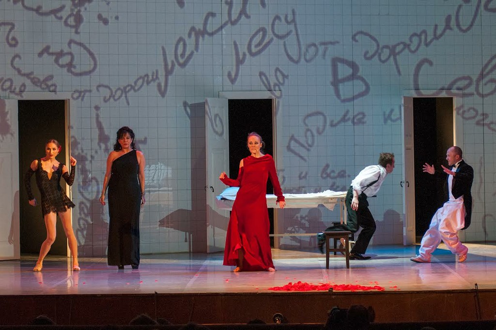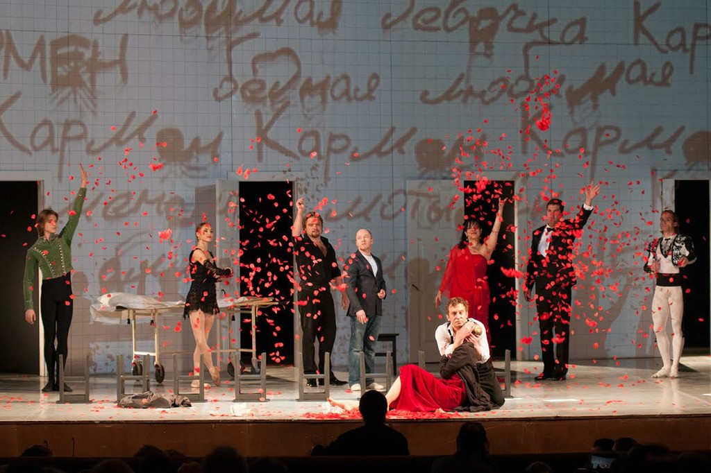 В спектакле обнаружились целых три Кармен — оперная (солистка Метрополитен-опера, знойная меццо Нэнси Фабиола Эррера), балетная (точеная фигурка и графически строгий рисунок партии Екатерины Шипулиной из Большого театра радовали глаз) и драматическая (Ольга Ломоносова). Карменситам были приданы три Хосе: балетный (великолепный Денис Родькин), оперный (тенор Виктор Антипенко вполне удовлетворительно справился с партией) и драматический (Михаил Трухин, герой детективных сериалов про ментов, выступил в необычном для него амплуа).