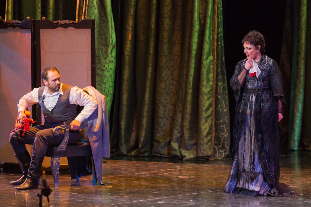 — Думаю, что и этот вариант вполне жизнеспособен. Тем более, что я изначально слышал эту оперу с большим симфоническим оркестром, но все же камерная сцена дает возможность рассмотреть и насладиться всеми деталями. Хочу еще сказать, что всегда получаю удовольствие от великолепно подобранного состава певцов-актеров: Станислав Трифонов (грубовато-неуклюжий Смирнов-Медведь), Елена Бунделева («безутешная» вдовушка Попова) Юрий Болотько (подобострастный лакей Лука). Насколько органичное и эмоционально точное попадание каждого из них в интерпретируемый персонаж-образ! Правда, акустика зала сказалась не самым лучшим образом на качестве исполнения — певцам приходилось форсировать голос, зачастую наблюдался дисбаланс с оркестром, перекрывавшим вокал.