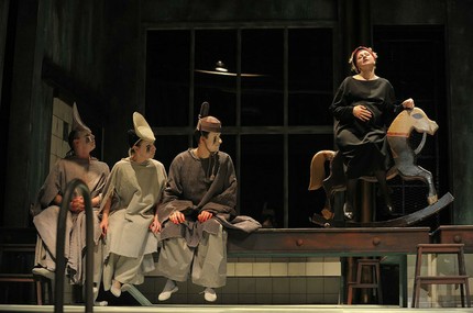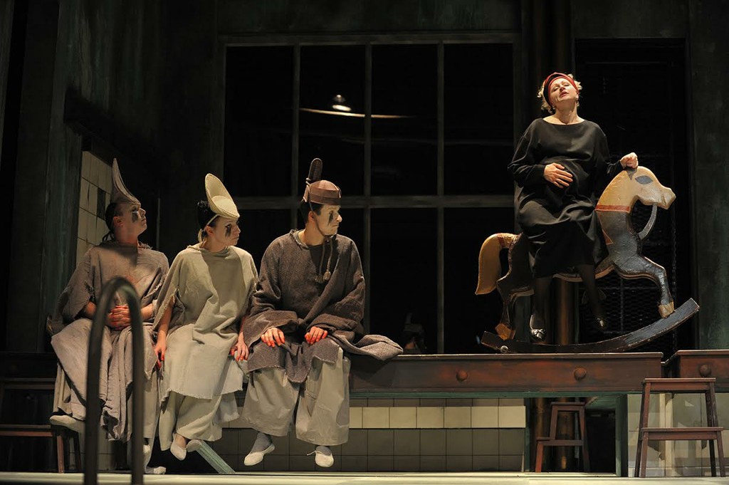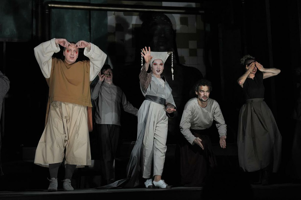 Такой вот разговор трех премилых женщин можно было услышать в антракте оперы. Самое забавное, что каждая из них — права! Оттенок античности был, конечно, минимальный, но все же был, благодаря множеству декламаций и условной манере игры. «Японизмов» же можно обнаружить сколько угодно: от совсем очевидных намеков в виде белого грима и костюмов героев в стиле кимоно (художник по костюмам Нина Васенина), рисунков флага страны восходящего солнца на ладонях у трио-комментатора (Сгустка), до притаившихся сбоку от сцены колоколов с иероглифами (художник-постановщик Александр Лисянский). Присутствие «жёстких сцен», типа вырывания глаз и почти «харакири» детей Тития, преподанных скорее в антидраматической манере, тоже очень органично вписываются в японскую культуру представления.