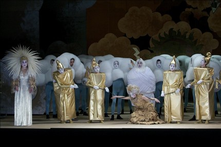 ведь именно оно является необходимым атрибутом комиксов вообще – это та зона на рисунке, в которую художники помещают словесный текст. На протяжении всей оперы облаками обрамлена сцена, но их настоящий «звездный час» наступает в сцене похищения Европы во втором действии, когда по всему сценическому пространству начинают бегать и кружиться мимансисты в воздушных белых костюмах. Забавный ход, но за время довольно продолжительной арии Европы, написанной в традиционной форме da capo, эти персонажи успевают порядком надоесть, и пропагандируемое постановщиком «perpetuum mobile» становится, как ни прискорбно, просто мельтешением.