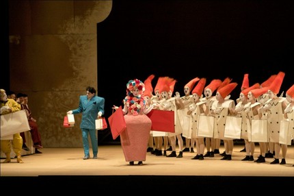Что же в постановке собственно от комикса? Заявленный жанр позволяет «разгуляться» фантазии и художника по костюмам (Анастасия Бугаева), и сценографа (Тимофей Рябушинский). В результате на сцене отсутствуют привычные пропорции, всё нарочито преувеличено, а миманс и хор, и даже примадонна появляются в 3D одеждах, которые делают персонажей похожими на ростовых кукол.