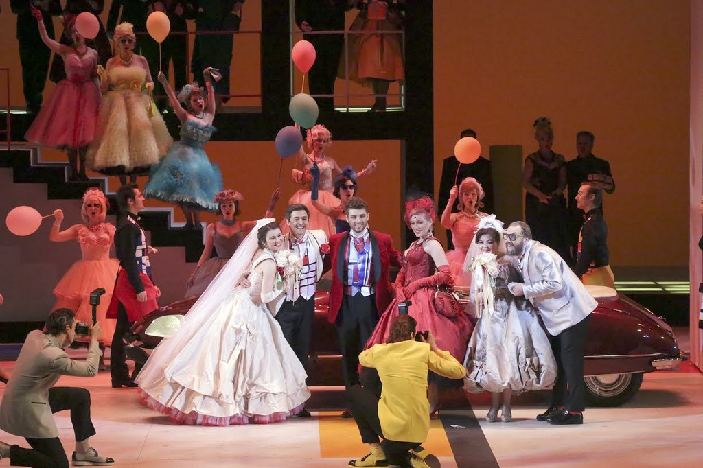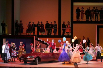 Сначала это интерьер офиса, в котором Граф «вершит свое правосудие». Затем интерьер плавно перетекает в экстерьер: молодожены Фигаро и Сюзанна въезжают в него на элегантном авто с открытым верхом. Этот же автомобиль в последнем акте оперы — акте тайных свиданий — станет важным атрибутом, вокруг которого, наряду с двумя беседками-коробками, дополняющими ячеистую структуру на заднем плане, и будет разворачиваться финал. Обычно он всегда кажется очень затянутым, но на этот раз режиссерские мизансцены заставляют пролететь этот акт весьма стремительно: скучать на нем вовсе не приходится!