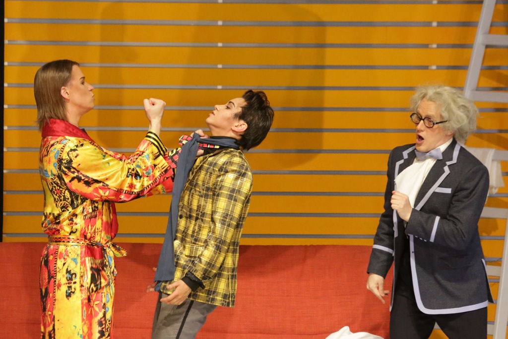 Кажется, что фабула перенесена в 10–20-е годы прошлого века, но при этом — с рядом вкраплений анахронизмов более поздних лет. Вневременной и при этом явно современный акцент отношений между героями, хотя и насквозь пронизан идеологией очень здорового и мягкого космополитизма, с уверенностью дает комфорт зрительскому восприятию и в плане мизансцен, и в плане сценографии, и в плане эклектики костюмов. Нас приглашают в мир моды от брюк-дудочек и классически строгого, обтягивающего покроя женской одежды до жилетов «супрематической» расцветки и дизайнерских женских туалетов как главных персонажей, так и массовки хористок-статисток. Нас приглашают в мир весьма рационального и практичного дизайна интерьеров и простейшей серийной меблировки в стиле IKEA, основанном на главенствующем принципе яркой цветовой монохромности.