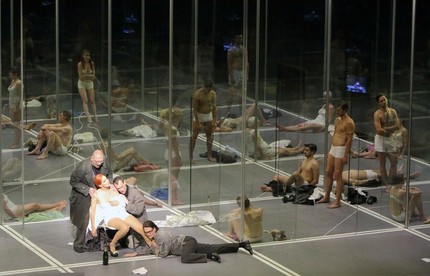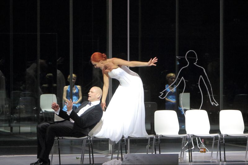линии общества, пантомимой демонстрирующей этапы взаимоотношений мужчин и женщин на протяжении всех музыкальных интерлюдий оперы (хореография — Татьяна Баганова). Сильнейший магнетизм, всё время меняющий свою полярность от невероятной страсти к столь же невероятной ненависти, приводит к полному истощению, обнажению измученных людей.