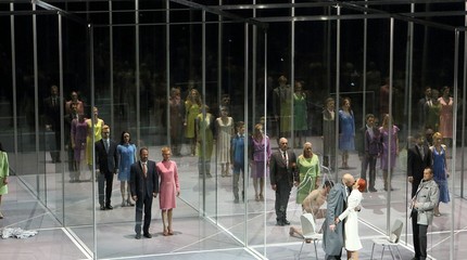 Чтобы полностью сконцентрировать внимание на предельно насыщенном психологическом взаимодействии персонажей, сценографическое решение на этот раз выполнено в тотально-минималистическом варианте. Отказавшись от привычных комнатных закрытых коробок, в которых обычно и происходило скрупулёзное копание в проблемах героев, Черняков пришёл к иному, условно-символическому варианту сценографии: неуютный стеклянный лабиринт, где можно потеряться, но невозможно скрыться и невозможно уйти.