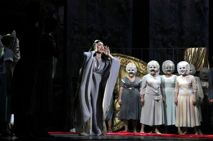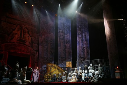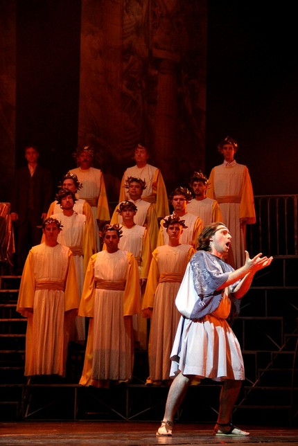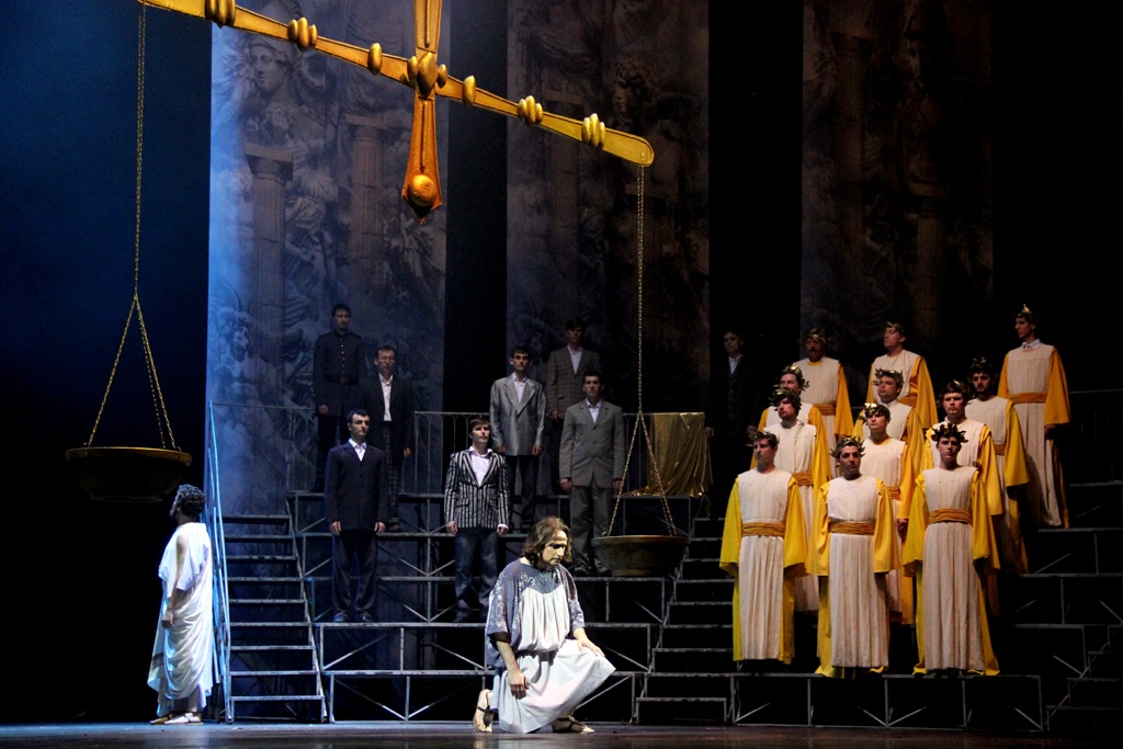 в подлинно захватывающей зрелищности. Сценография постановки основана на легко узнаваемой древнегреческой символике, обретенной нынешними поколениями человечества, благодаря серьезным достижениям историко-археологической науки, и ничего конкретного, что отсылало бы к локализации той или иной картины оперы, не предполагает. Хотя при этом в спектакле и возможно узреть нечто конкретное, хрестоматийное, не в этом дело!