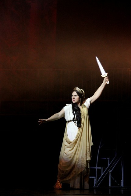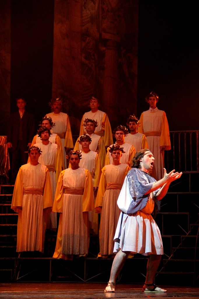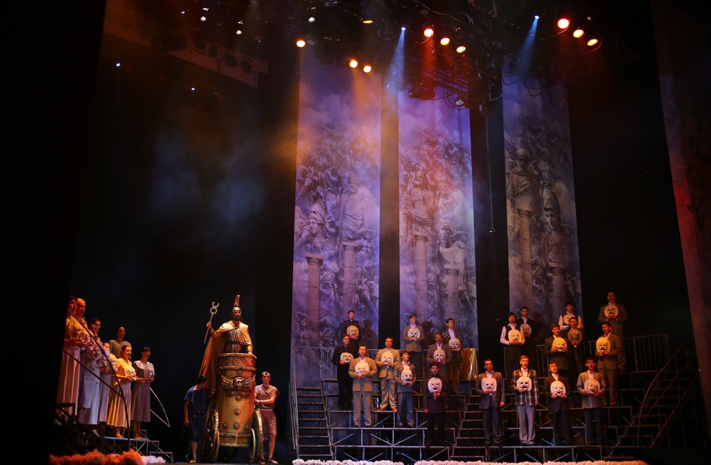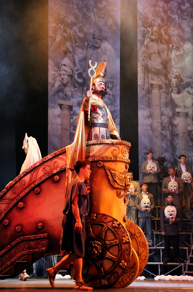Глядя на сцену из зала, на расставленные амфитеатром трибуны, на живописные, в греческом стиле расписанные задники, на богатый, постоянно меняющийся видеоряд, на потрясающе стилизованные под Древнюю Грецию костюмы главных и второстепенных персонажей, мы легко домысливаем всё, что полагается увидеть в этой опере согласно ее сюжету.