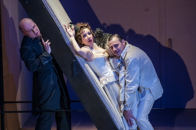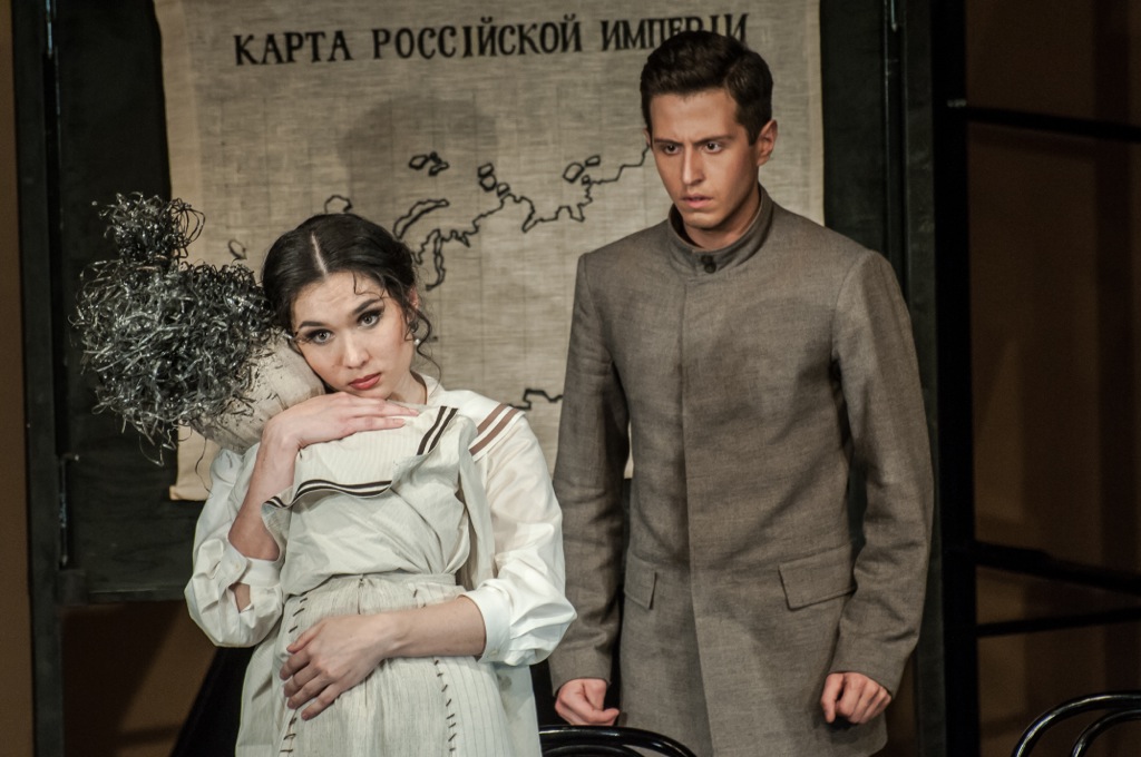 — композитор устраивает полифонию сцен, сочетая в единовременности разговоры разных героев в разных местах, и, безусловно, этому следует и режиссёр. Благодаря предельно лаконичной сценографии (Степан Зограбян), рисующей каждое пространство лишь одной условной деталью (школьная доска в гимназии, лестница в доме мадам Коковкиной, где живет гимназист Саша, фортепиано у сестёр), компиляция происходит легко и мобильно. Художник по свету Евгений Ганзбург прекрасно дополняет эти сцены, а порой и является главным их организатором, создавая гигантские тени, затмевающих самих героев.