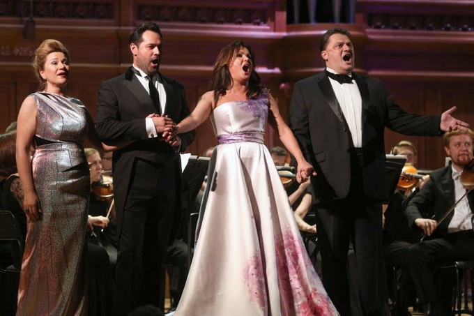 В самом последнем выходе «четвёрки», уже после всех бисов, солировал Абдразаков. Выбор для завершения академического концерта романса «Очи чёрные» сомнителен. Да ещё и все, включая дирижёра, вышли поверх платьев в белых майках с фото Хворостовского и надписью: «Дима, ты победишь!» Идея таким образом поддержать наш мужской «национальный символ оперы», сейчас борющийся с тяжёлой болезнью, благородна и остроумна. Но неужели нельзя было подыскать для музыкального привета коллеге произведение не столь банальное, подпорченное кабацкой репутацией?