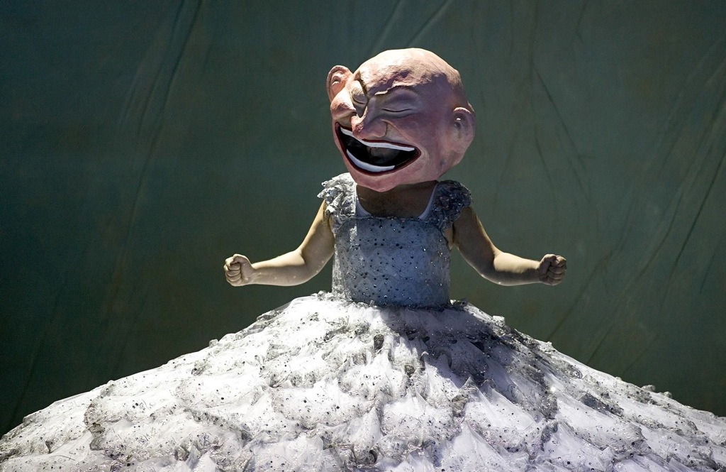 В первой сцене бала, во время звучания намеренно фальшивой записи, на сцене находится неизвестный человек в белом платье с огромными обручами, подобных тем, что требуют самые капризные невесты. Здоровенная голова, с жутковатой гримасой-ухмылкой на лице дополняет этот и без того экстравагантный облик. Все герои, включая герцога со своим карликом-двойником, постепенно вылезают из-под широких полов. И кто это может быть? Совершенно очевидно — Риголетто!