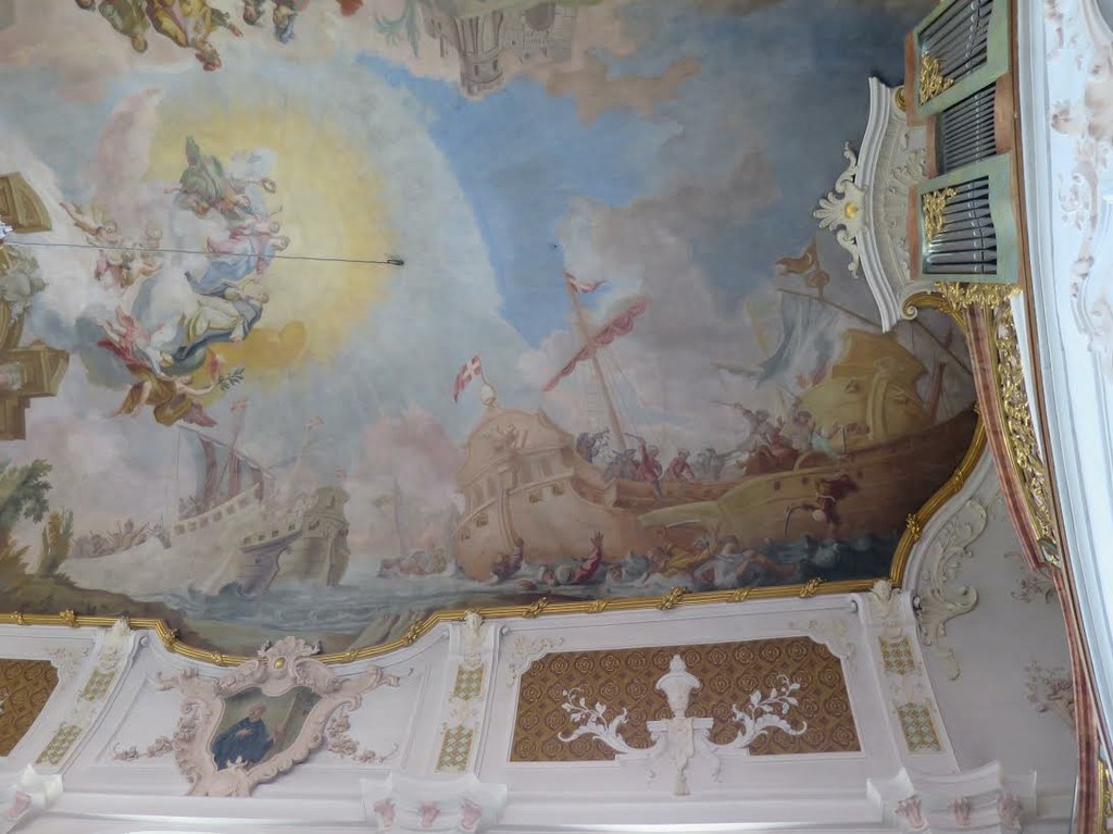 — Это наш маленький вклад в борьбу за мир. Почти 450 лет прошло, как мусульманская империя потерпела сокрушительное поражение, а противостояние остаётся, проблемы абсолютно те же: борьба за мировое господство, противоборство востока и запада, ненависть христиан и мусульман, замешанная на совершенно экстремистских идеях, не имеющих никакого отношения к сакральным текстам. Когда вы услышите, как звучит османская и итальянская музыка XVI века, то отметите, что обе культуры выступают на одинаково высоком уровне, и выбрать между ними будет сложно, и темы будут пересекаться и расходиться в увлекательные стороны, бойкий итальянский стих не победит витиеватую песенную прозу османов, вот в чём дело. Кстати, мысль о концерте на тему битвы при Лепанто пришла ко мне внезапно, когда я вспоминал знаменитые фрески баварских церквей. Здесь в Прине, рядом с курзалом, где мы с вами беседуем, есть церковь Успения Богородицы, которую расписал Иоганн Баптист Циммерман в середине XVIII. Изумительна его фреска «Битва при Лепанто», выполненная в лучших традициях баварского рококо. Тематически она рассказывает о великой победе христиан, но завитушки рококо, парящие на облаках ангелы отвлекают от военной темы и уводят в совсем иные миры.