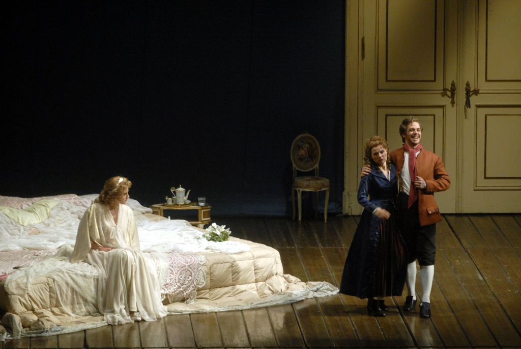 В последний раз эта постановка возобновлялась в 2008 году со следующим составом (лишь его и можно увидеть на фото, официально предоставляемых сегодня театром): Маркус Брюк (Граф), Жаклин Вагнер (Графиня), Джорджо Каудуро (Фигаро), Дитте Андерсен (Сюзанна), Ульрике Хельцель (Керубино). В увиденном же мной спектакле расклад солистов был следующий: американский баритон Джон Чест (Граф), сопрано из Италии Федерика Ломбарди (Графиня), хорватский бас Марко Мимика (Фигаро), сопрано из России Елена Цаллагова (Сюзанна), меццо-сопрано из Америки Ирене Робертс (Керубино).