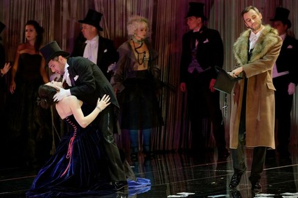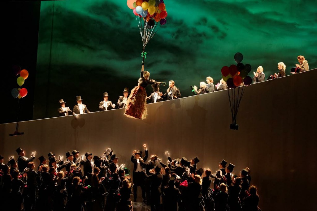 Позже в гавоте Мишкунаите чуть не хватило уверенной вокальной раскованности. Картина же в целом была восхитительна: мир куртизанок, где поначалу всё кажется несерьёзной игрой, предстал во всей своей прелести. Небо залили зелёным цветом, под потолком слегка покачивались букеты из разноцветных воздушных шариков.