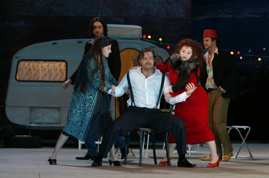 Первый взрыв хохота в зале раздался уже в конце увертюры, когда из фургончика-прицепа, одиноко стоявшего на сцене, один за другим бесконечно начали выходить цыгане в балканском стиле, так, что вообще невозможно себе представить, как они все могли туда поместиться. Цыгане вынесли из прицепа пластиковые стулья и выгрузили кое-какие пожитки в клетчатых полиэтиленовых пакетах.