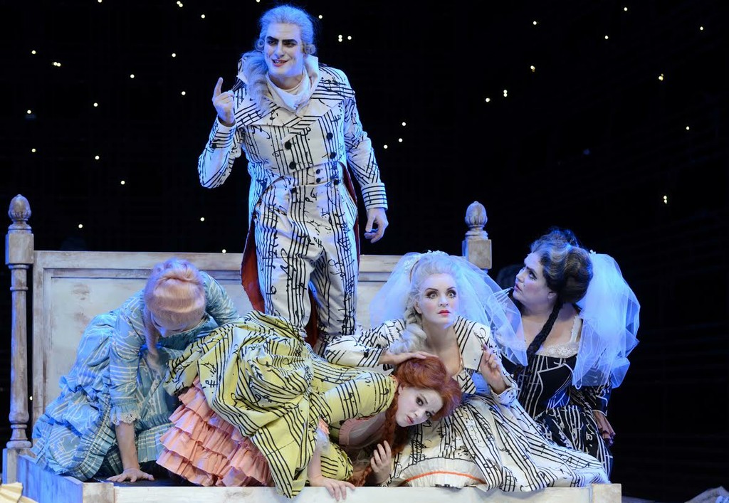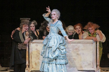 Из эпохи Моцарта и Бомарше в гамбургский спектакль перенеслись пудреные парики, корсажи, шпага и красные туфли Сюзанны с бантами.