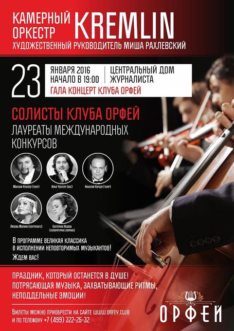 23 января в московском Доме журналиста состоится гала-концерт солистов клуба «Орфей» и Камерного Оркестра «Kremlin» под управлением дирижера Миши Рахлевского.