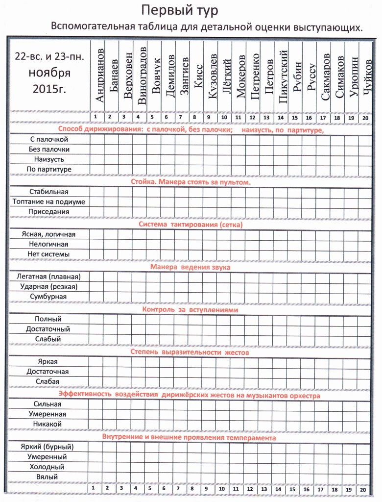 Исходя из этого, мы всё подробнейшим образом обсуждали. И тут Симонов проявил себя беспрецедентно. Ещё на первом конкурсе в 2011 году он разработал систему оценки каждого дирижёра по элементам профессии, в которой 60 позиций! Изначально предполагалось, что каждый член жюри сделает отметку в каждой из 60 строчек оценочной таблицы по каждому участнику. Но в итоге мы обошлись без таблицы, хотя всё равно каждого конкурсанта обсуждали именно по этим критериям. Я, кстати, эту таблицу показывал всем обучающимся дирижированию в Нижегородской консерватории. Когда они её видят, у них глаза расширяются. Они понимают, что наша профессия может быть разложена на элементы, и каждый элемент оценён. И все эти элементы должны быть у дирижёра на высоте.