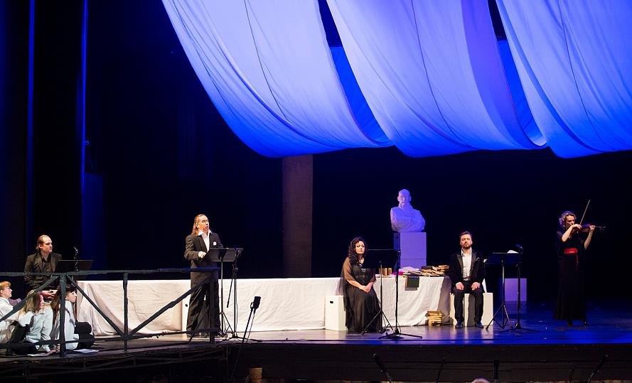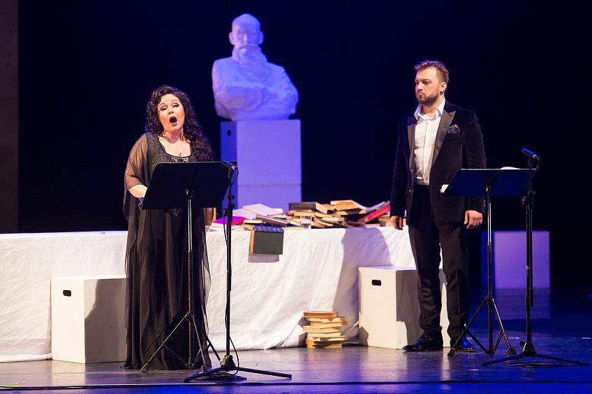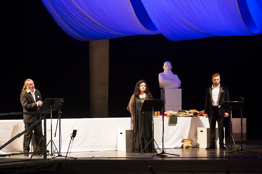 Если учесть, что эти вопросы оказались самими популярными на премьере настоящего мирового раритета — оперы Р. Леонкавалло «Цыгане», стоявшего в паре с пленительным «Алеко» С. Рахманинова, то это может показаться немного странным. И тем не менее только ленивый зритель не поинтересовался, к чему на полупустой сцене во время концертного исполнения опер про цыган (!) оказался бюст мужчины с окладистой бородой, неподалёку от стопки книг на белой скатерти. И ведь и вправду, к чему? Но обо всём по порядку.