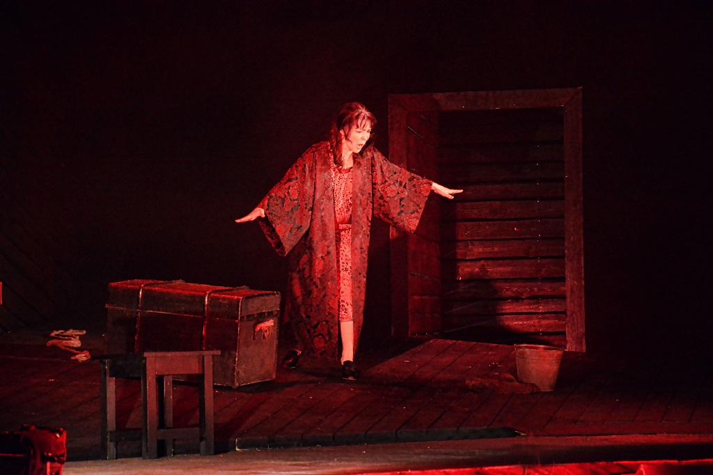 И уже после этого мы видим, что в отношении Марины – всё наоборот. Там – закрытое пространство, угол, из которого нет выхода, и то же самое небо появляется теперь с начала акта, но лишь до его середины: в финале Цветаева уходит во тьму. Будучи загнанной в свой угол, она не выносит на себе креста, который во многом сама на себя и накладывает. Вот она и пытается всё тщательно вымыть перед самоубийством: она уходит, но хочет оставить после себя этот мир чистым. То есть это всё тот же прием, о котором я уже сказал: соединение через контрастное сопоставление. Надеюсь, эти метафоры в спектакле читаются…