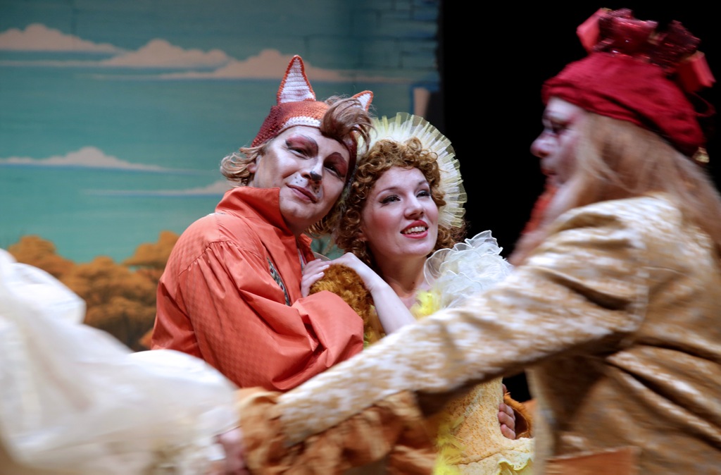 В одежде простота и лаконичность проявляются в том, что на артистах-лисятах — рыжие комбинезоны, хвост и шапка с ушками, а на артистах-цыплятах, соответственно, жёлтые костюмы и шапки с клювами. Яркое впечатление производит наряд петуха Петруса Карлссона (Максим Усачёв) – отца Тутты. Голову солиста украшает яркая шапка в форме гребня, к штанам приделан роскошный петушиный хвост, на заднике туфель – шпоры, а для создания эффекта крыльев под пиджаком красуется блузка с пышными воланами на рукаве.