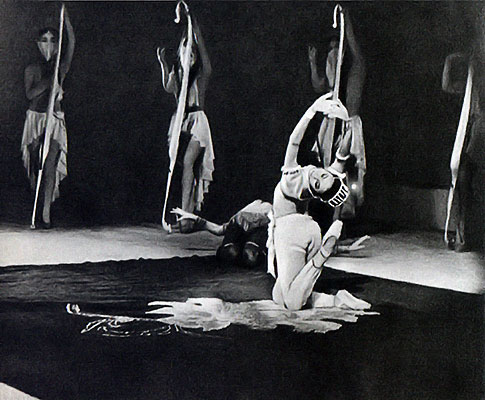 «Мелодия пляски необычайно красива, – писал Голейзовский в постановочной схеме к этому спектаклю. – Даже европейское ухо бывает ею очаровано. Оканчивается эта пляска на совершенном замирании, причём пляшущая касается земли спиной и затылком и проделывает это сложное движение, вздрагивая и стоя в положении на коленях, и положения ног не меняет».