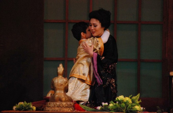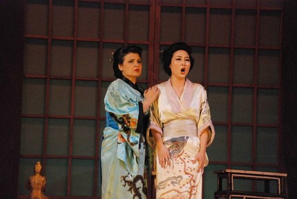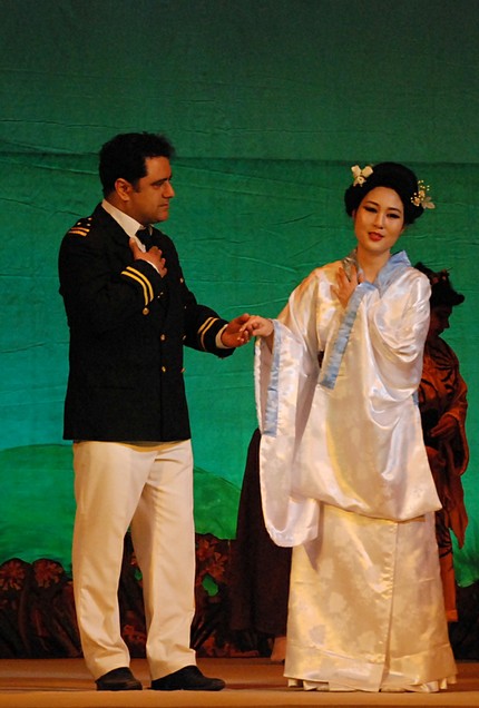 Тем более, спектакль по всем параметрам классический: как в плане сценографии (та же гора близ Нагасаки и японский домик с террасой в первом акте, по-японски аскетичное внутренне убранство дома — во втором акте), так, в плане мизансцен, и особых экзерсисов от главной исполнительницы не требует — в наличии должен быть голос да способность проживать судьбу героини. И с тем, и с другим у корейской исполнительницы были явные проблемы.