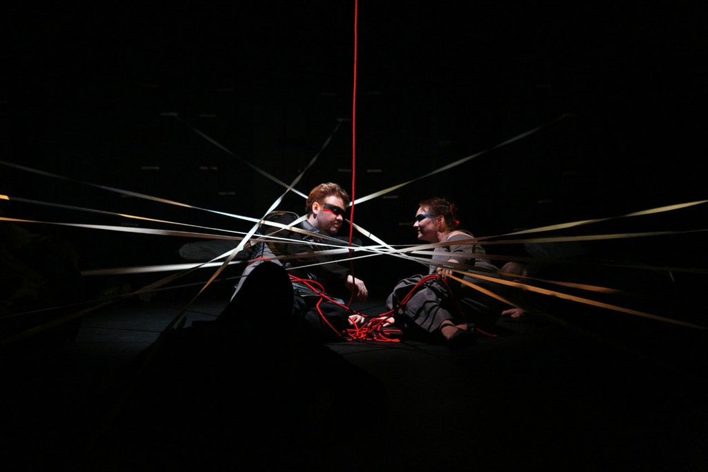 А дальше начинается самое интересное. С целью достичь музыкально-театральной общности стилистически разноплановых опусов, режиссер-постановщик обеих одноактных опер Екатерина Василёва (первая звучит меньше сорокá минут, вторая – чуть дольше) сюрреализм мифа об Ариадне в той версии, в какой он представлен в либретто, усиливает еще больше. После поединка с Минотавром Тезею, убивающему лишь свою любовь, но не себя, и оставляющему Ариадну плакать на Крите почти девять минут до окончания оперы, в принципе, ничто не мешает вернуться со своими спутниками в Афины. Но в спектакле Тезей-воин, всё-таки «реально убивая себя» после того, как весьма эффектно перерезает путеводную нить Ариадны, уходит в небытие, то есть умирает. А убитого «влюбленного Тезея», успевшего стать мужем Ариадны, его друзья как раз и доставляют на родину.