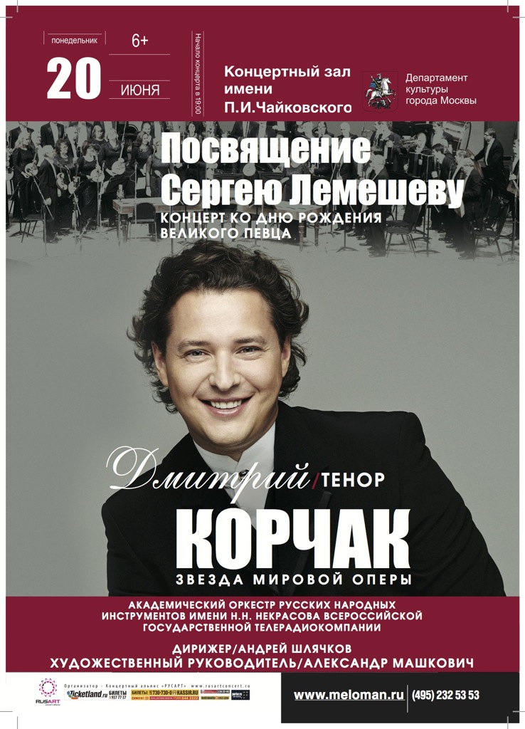 В преддверии дня рождения великого русского тенора Сергея Лемешева впервые на сцене Концертного зала имени П.И. Чайковского в оригинальных аранжировках прозвучат произведения из репертуара этого легендарного оперного певца. Его глубокое искусство, драгоценный сплав голоса и высокого мастерства – результат большой и упорной работы. Каждая его песня несет в себе печать мудрой простоты и непосредственности, проникая вам в сердце и задевая сокровеннейшие его струны. В искусстве Сергея Лемешева счастливо сочетались блестящие вокальные возможности и глубокая содержательность творческой натуры. В этот праздничный вечер свою дань великому артисту отдаст великолепный тенор Дмитрий Корчак в сопровождении Академического оркестра русских народных инструментов имени Н.Н. Некрасова Всероссийской Государственной телерадиокомпании.