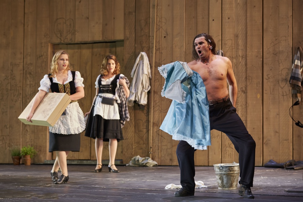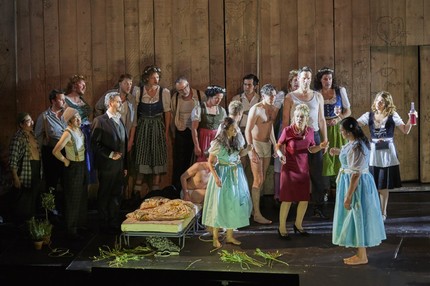 «В опере звучат преимущественно мужские голоса. Возникает образ женщины, окруженной грубыми, шумными сексуализированными мужчинами, которые не могут себя контролировать», – продолжает делиться результатами своих медитаций над партитурой Кристоф Лой. Вот и вчерашний подросток Левкипп (Петер Лодахл), впервые влюблённый и разбивший в расстроенных чувствах свою флейту, становится едва ли не самым грубым и простецким среди этих мужчин, лишённым какой-либо трогательности.