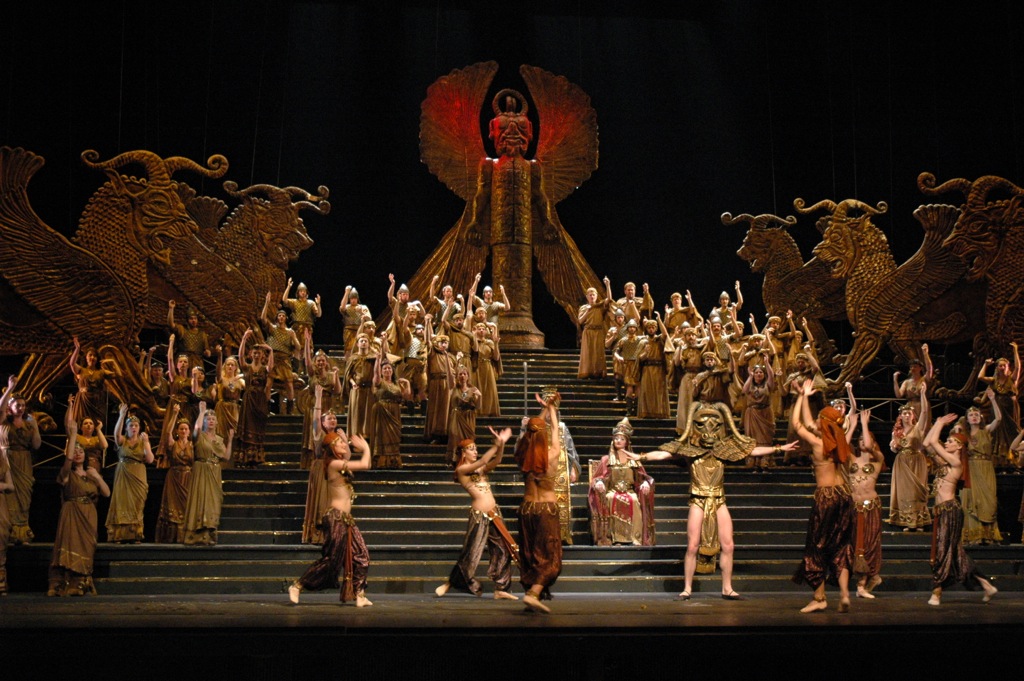 Крылатые ассирийские быки и каменно-золоченые языческие идолы… Проекционные символы разрушенного Иерусалимского храма… Богатый этнический антураж живописнейших костюмов… Потрясающе эффектные массовые и хореографические сцены… Первое захватывающее появление Набукко на коне в сопровождении эскорта четырех конных всадников… Отдаленно-абстрактная ассоциация с «висячими садами Семирамиды» в сцене Абигайль в начале второго акта… Всё это работает исключительно на развитие интриги, на эффектную действенность и богатое психологическое наполнение мизансцен, выстроенных классически строго, масштабно, зрелищно, а в актерском плане – абсолютно целостно и правдиво.