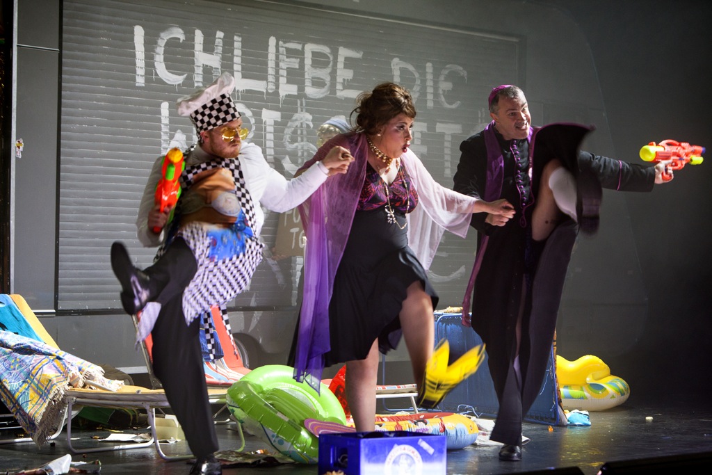 Удивительно, но та постановка, несмотря на существенно меньшую степень визуального натуралистического эпатажа и более сдержанный по сравнению с почерком Биейто характер, оставила впечатление тягостной гадливости и полной постановочной беспомощности. Но нынешнее возобновление постановки в Антверпене в ее оригинальной немецкоязычной редакции даже при обилии в ней обнаженной натуры (как женской, так и мужской!), даже при наличии еще более недвусмысленных грязных намеков производит впечатление единой «праздничной» феерии, номерного яркого мюзикла, жанровая природа которого, в сущности, еще более условна, чем оперная. Реалистично-кровавая драма персонажей проходит через ряд человеческих потерь, но мы словно внимаем спектаклю-шоу, спектаклю-ревю: серьезные глубинные корни социального конфликта спрятаны в нем за оболочкой феерически выстроенного визуального ряда.