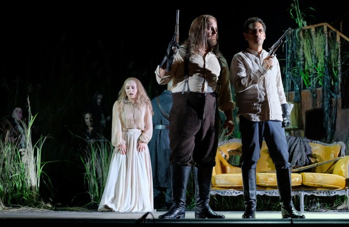 Но главной приманкой новой продукции, понятно, стал вовсе не он, а знаменитый перуанский «соловей» Хуан Диего Флорес в партии короля Шотландии Якова V (персонажа, открывающего свой статус лишь к финалу оперы и бóльшую часть ее фигурирующего под именем охотника Уберто). Либретто этой мелодрамы в двух актах сочинил Андреа Леоне Тоттола по одноименной поэме Вальтера Скотта. Изюминкой же проекта явилось то, что в партии Родриго (политического противника короля и соперника Малькома за руку Елены) был заявлен еще один знаменитый тенор, американец Майкл Спирес, а их дуэль в спектакле, в которой Родриго погибает, априори обещала – не только в сюжетном, но и в вокальном отношении – стать весьма захватывающей. Так ведь и вышло!