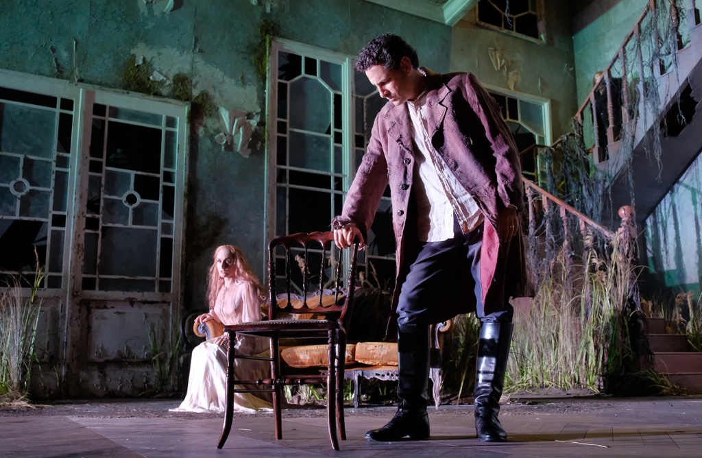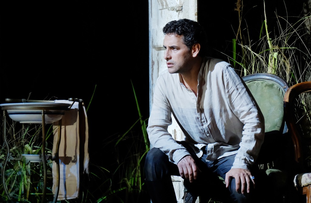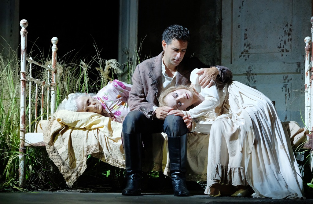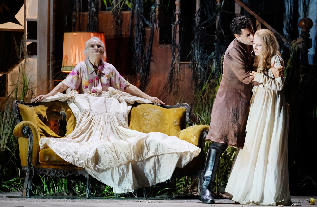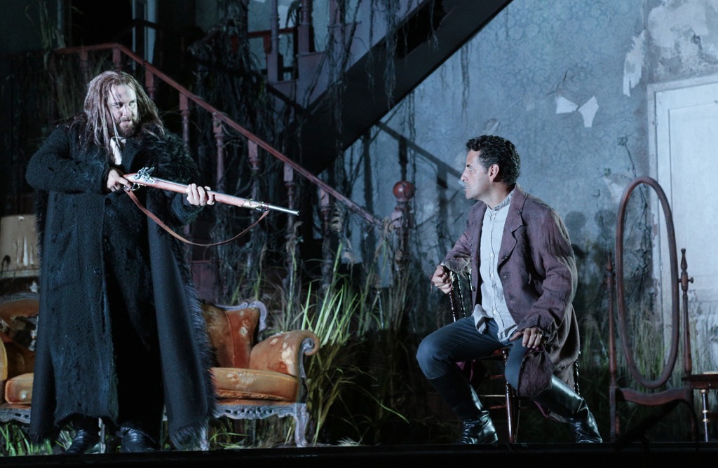 а не поставить оперу Россини в духе ее либретто и романтического настроя музыки. Представляя всю историю как воспоминание состарившейся семейной четы Елены и Малькома и выводя на сцену бессловесных стариков (бабушка Елена – Джузи Мерли, дедушка Мальком – Алессандро Бальдинотти), которых как бы и нет, но которые для зрителя вполне реальны, режиссер создает сложный костюмно-сценографический квест, наполненный мрачно-унылой – в эстетике гнетущей атмосферы дома престарелых – эклектикой мизансцен и пластических этюдов с этими озёрными стариками-призраками.