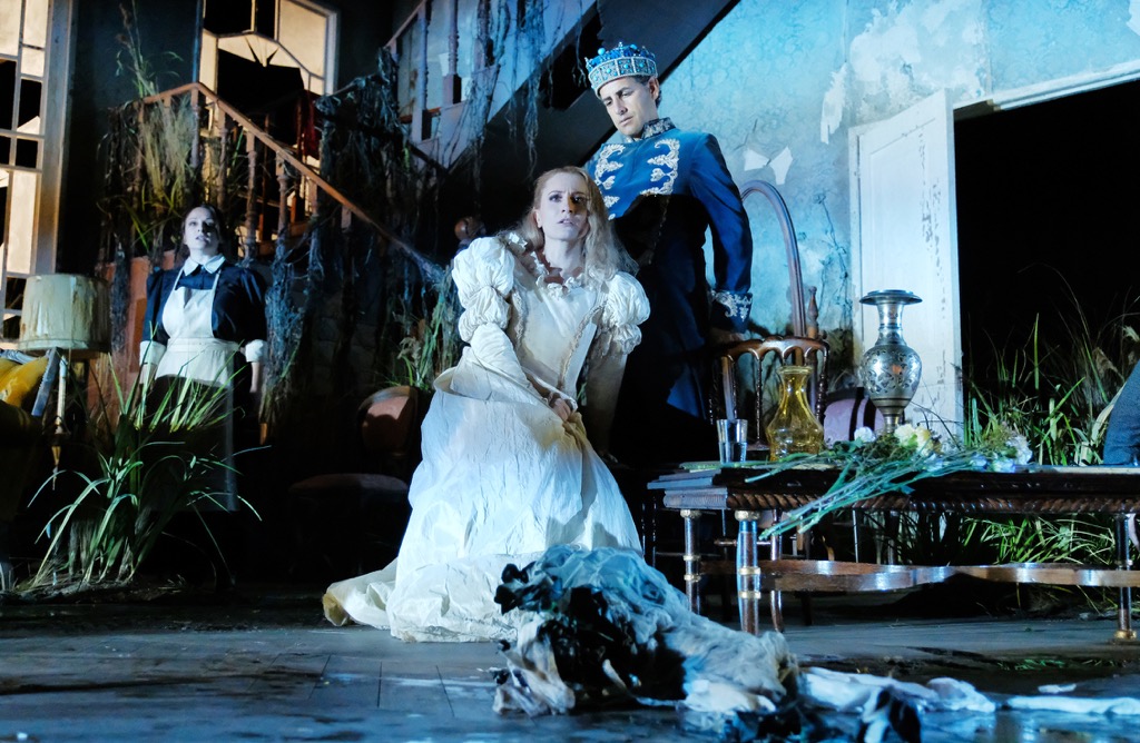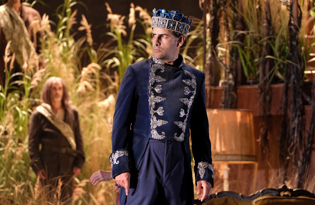 Она ассоциируется со столом, на который сразу выставили всё – и закуски, и напитки, и основные блюда, и десерт. Так что выбирай хоть хижину Елены, хоть дворец короля, хоть пышное буйство природы! Всё это на сцене присутствует одновременно, всё это визуально притягательно, но всё это никак не выстреливает в суть истории, рассказанной в либретто и положенной на музыку. Режиссер всего лишь придумывает параллельную историю о «дедушках озера»…