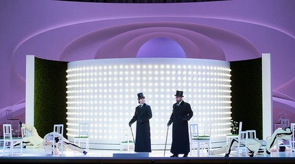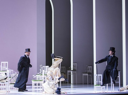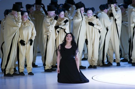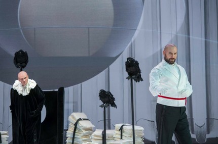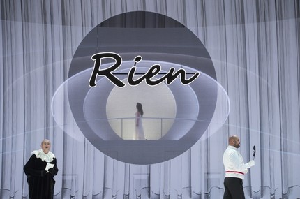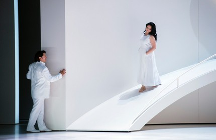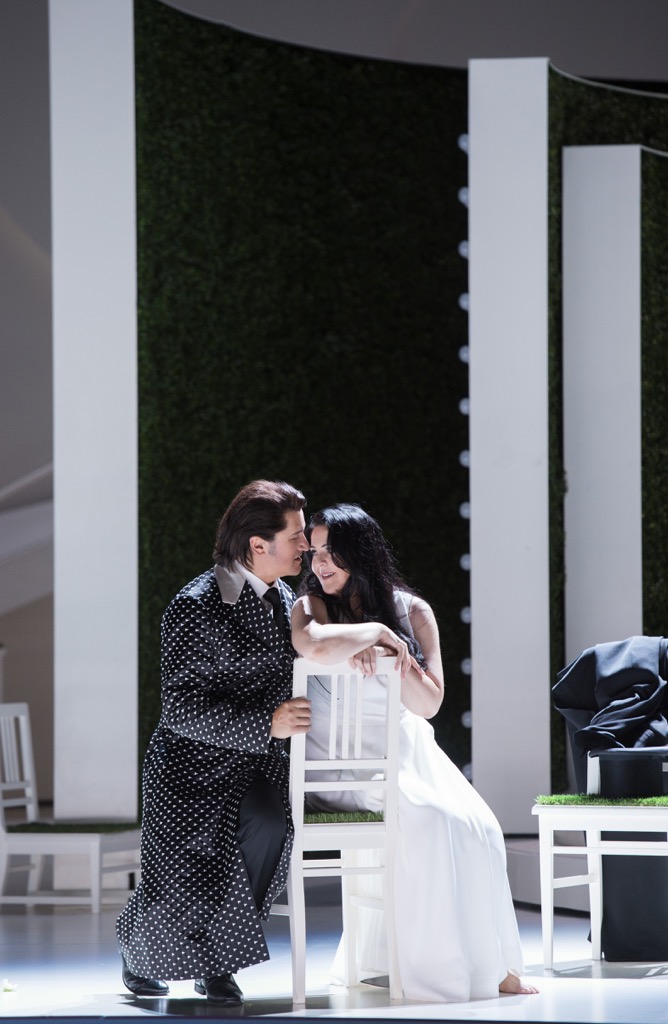 Словно позаимствованный из зальцбургской же «Травиаты» 2005-го года и немного модернизарованный белый твёрдый задник практически никак не обыгрывается, выполняя функцию пустой формочки с красивыми разводами овальчиков вокруг центрального отверстия и подиума, который уже в зубах у всех навяз. Ах, забыл! Из нижней части подиума еще полочки всякие выезжают три раза, вот. И всё это многозначительного больнично-белого цвета.