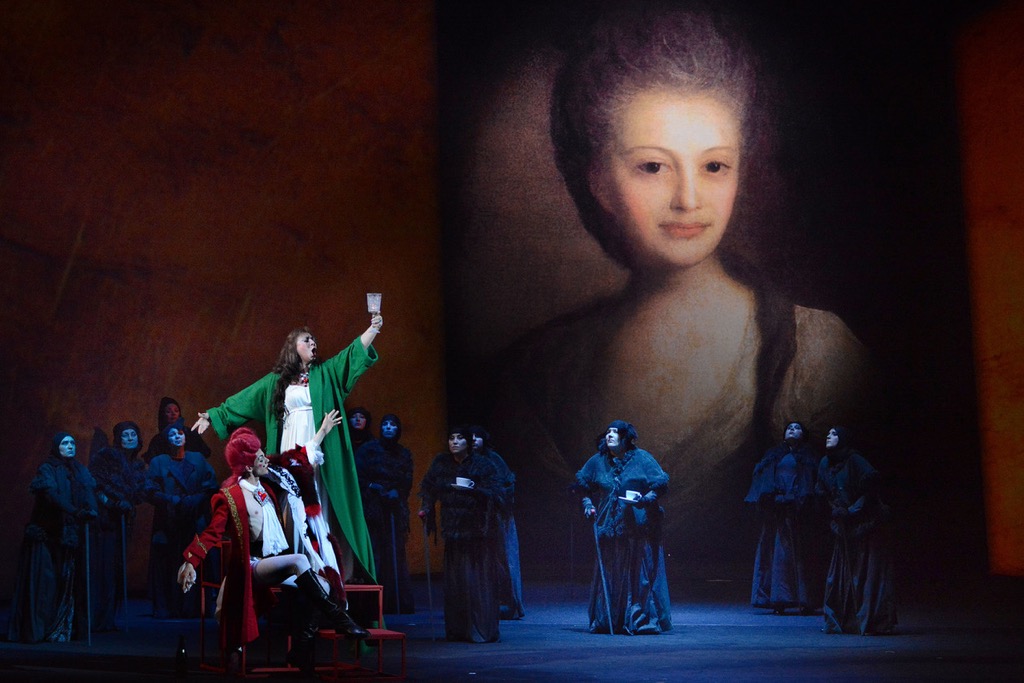 Новосибирский театр оперы и балета, принявший это название к постановке с целью открытия им нынешнего оперного сезона, выбрал кардинально иной путь. На этот раз команда автора новой художественной концепции и режиссера-постановщика Вячеслава Стародубцева, в которую вошли художник-сценограф Петр Окунев и художник по костюмам Жанна Усачева, решила, буквально, сыграть в оперу. С большим пиететом переосмыслив, но, что чрезвычайно важно, не утопив в новизне концепции хорошо всем известный сюжетный материал, названный постановочный триумвират сделал всё на редкость изысканно и эстетически красиво.
