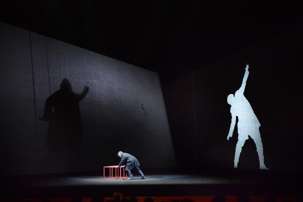 Пространство спектакля-пасьянса создается двумя разновеликими проекционными экранами. Ассиметрично расположенные, конфигурацию углов восприятия они меняют по ходу дела довольно легко и словно дышат тем, что происходит на сцене.