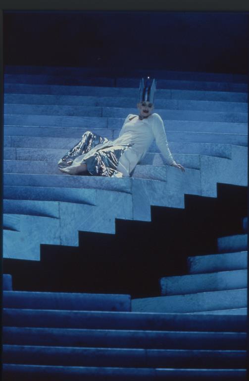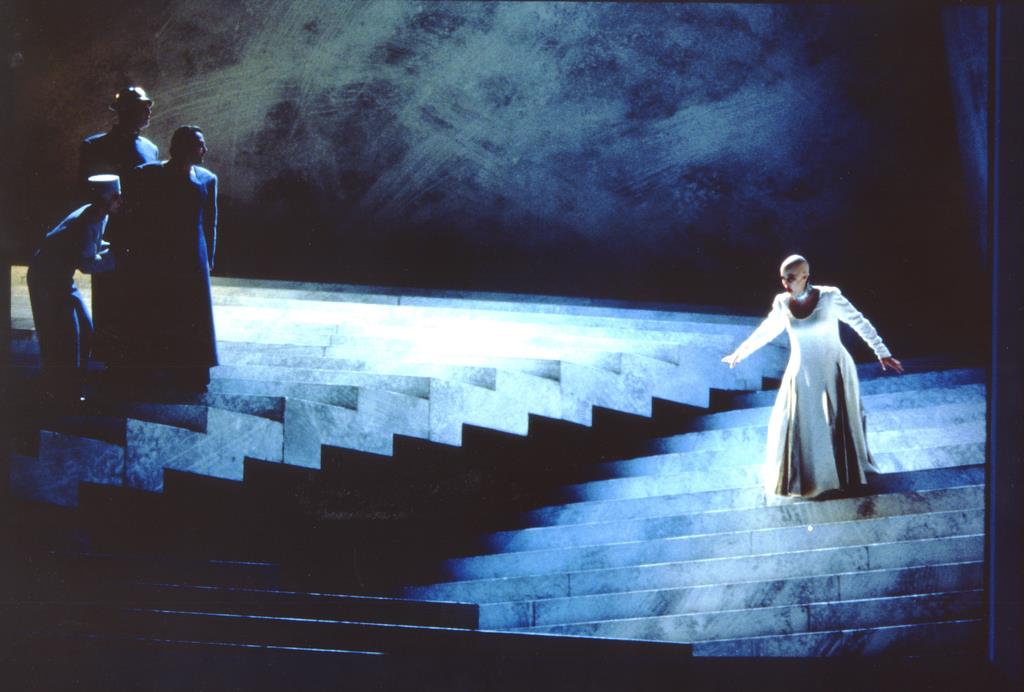 Но на этот раз в том, что касается чудовищности костюмов, команда постановщиков превзошла саму себя (художник по костюмам Вольфганг Гуссманн). Костюмы эти даже не оригинальны: белое платье и босые ноги я уже видела у другой декеровской принцессы, Мелизанды; такие же грубые чёрные туфли носили её муж и возлюбленный. В серых и чёрных удерживающих форму накидках сразу же узнается характерный силуэт, придуманный Ёдзи Ямамото. В буклете я прочла о том, что в иллюстрациях Бёрдслея к «Саломее» есть японские мотивы, и ужаснулась – неужели всё так глубоко?