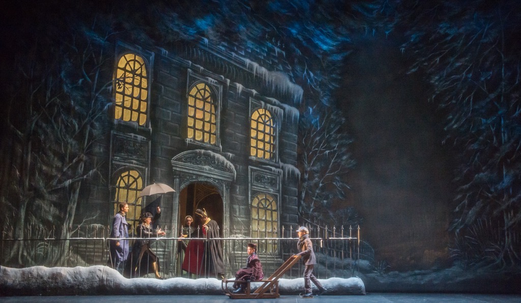Мило и таинственно смотрится на сцене эдвардианский дом с огромными окнами в снегопад, каток с припозднившимися танцующими на льду парами, и заснеженный ночной лес в Сочельник. Устарело и скучновато выглядят елка (по сути — обтянутые зеленой материей обручи, украшенные огнями) и убранство залы, где в предрождественскую ночь разыгралась эта невероятная история (дизайн сцены Питера Фарме).